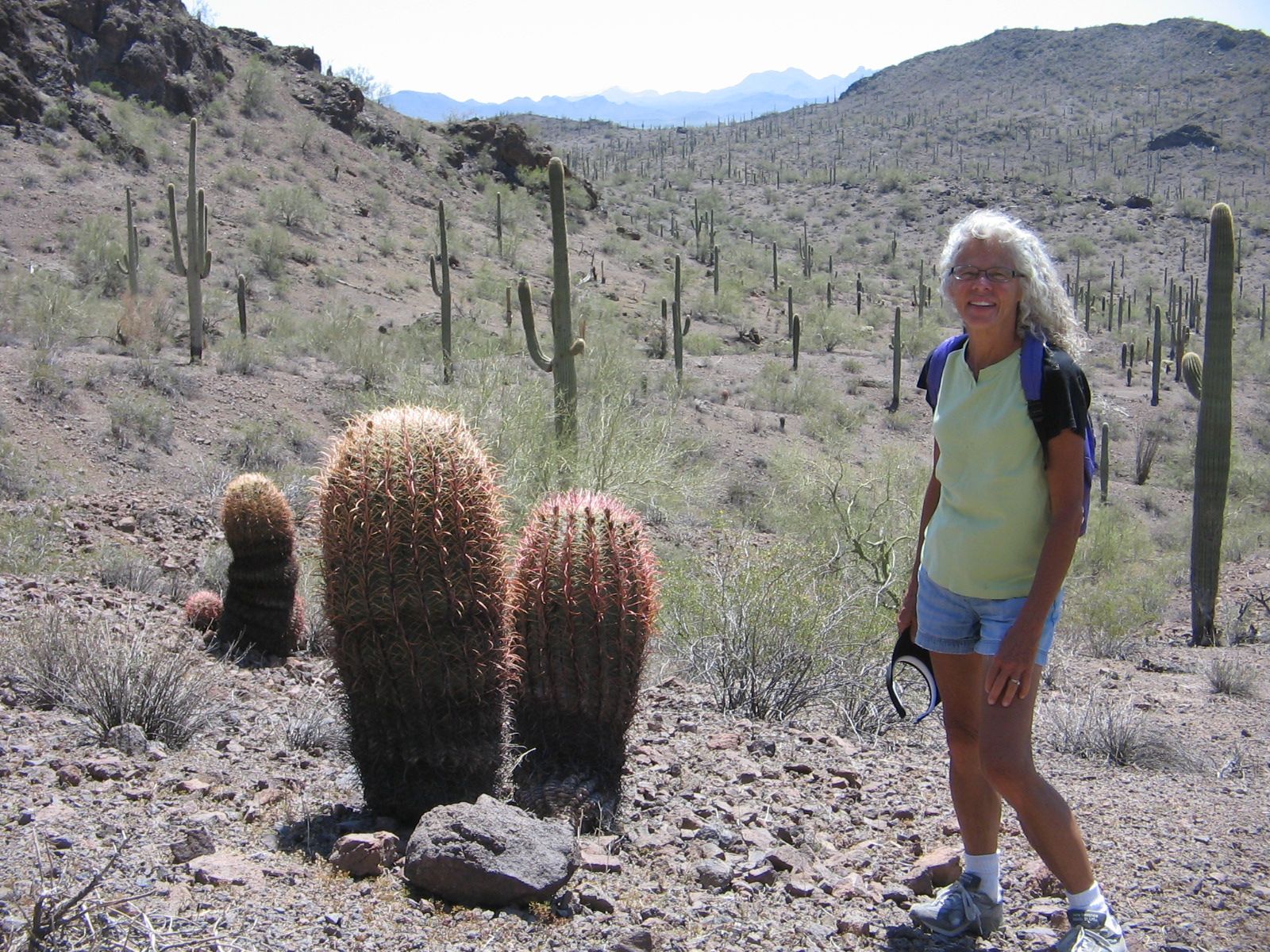Barrel cactus on Picacho Peak trail, saguaro cactus in background.