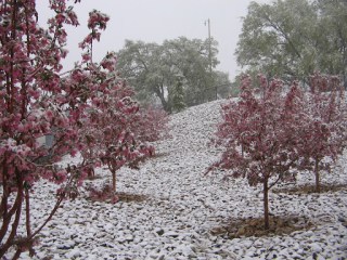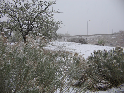 With the arrival of April, we thought our travels in the southeast and southwest had enabled us to escape winter snows. Not so, as we found out this morning in Albuquerque. After listening to a steady rain all through the night, we were greeted at first light this morning with the sight of big, white snowflakes coming down outside our motel window. We haven’t seen this much snow since last winter in northern Virginia.