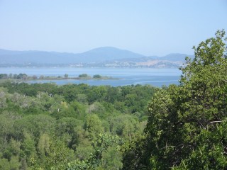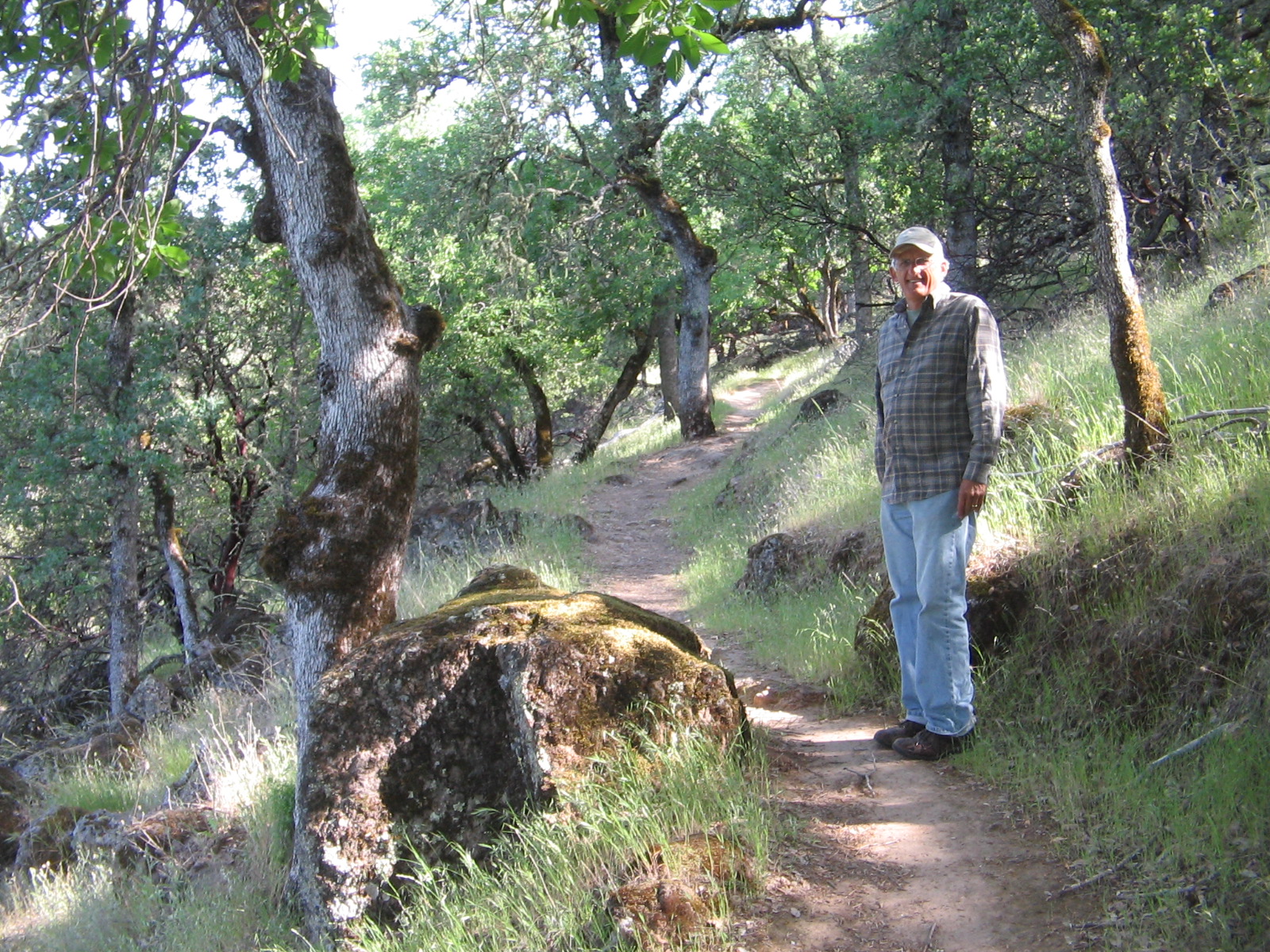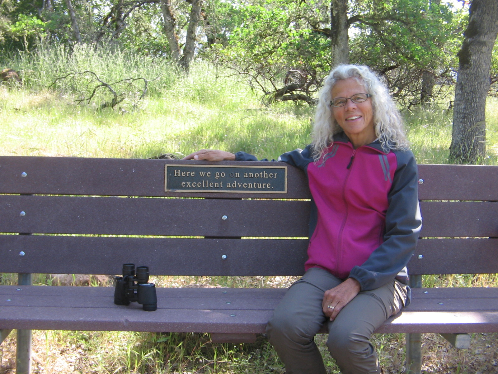 Yesterday, leaving Rio Vista and driving northwest, we passed through the beautiful Napa Valley, viewing miles and miles of vineyards bright with new spring growth. Our destination for the night was Clear Lake State Park on the shores of California’s largest natural lake. This campground was very quiet; no noisy peacocks to prevent a good night’s sleep. We had enough energy and time this morning that we were able to enjoy a hike on a forested trail over the ridges that surround the park and overlook the lake. One of the stopping points was the bench in the photo at the start of this post.
