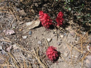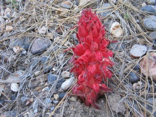 Driving the back roads in the area around Eagle Lake we noticed a bright red flowering plant that we had never seen before. We later discovered that this was Snow Plant, a parasitic plant that grows under pine trees in coniferous forests at higher elevations. A very odd-looking plant.