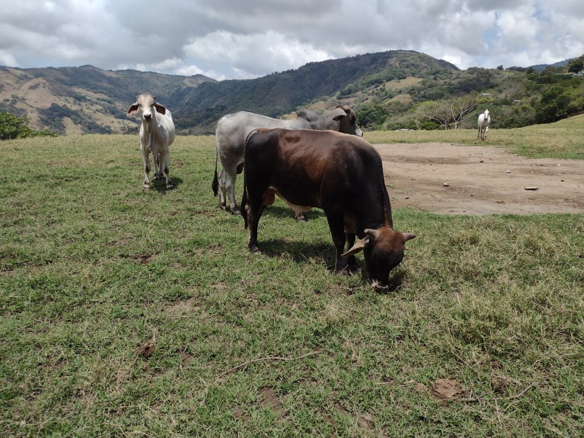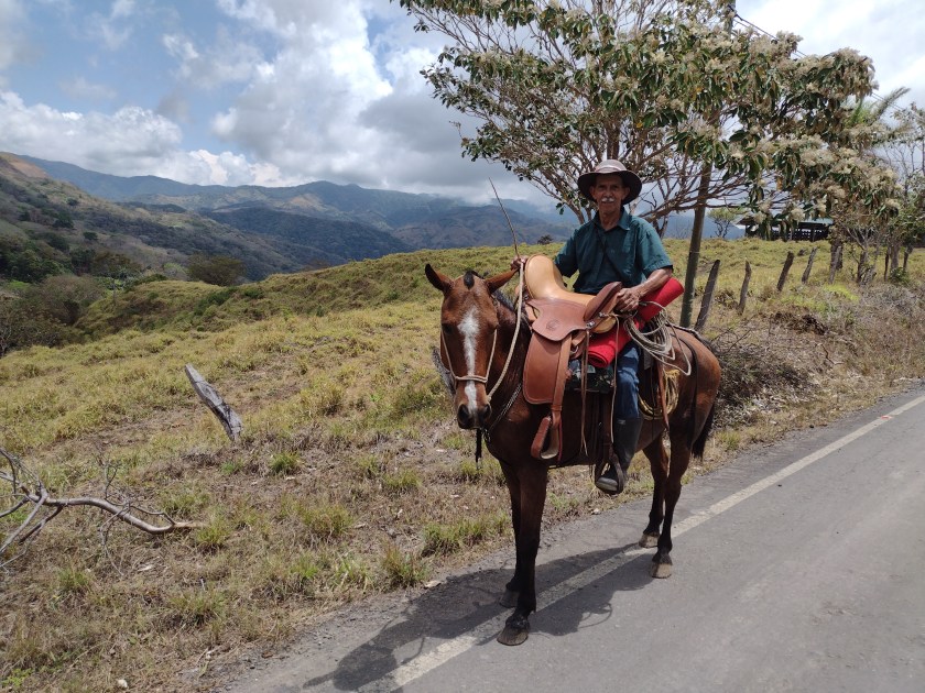 Shortly after breakfast we were packed and ready to be picked up for the 3-hour drive to Monteverde Country Lodge, our accommodations for the next two days. As we ascended the rough, winding road up the mountain the driver could see that we were excited by the surrounding scenery and he accommodated our requests to stop for photographs, as well as picking out spots he knew where we would get the best views. I was intrigued by the long-eared cattle in the pastures, a different breed than what we see in the US. A special encounter along the roadway required a stop to get a photo of a friendly vaquero, going about his business for the day.