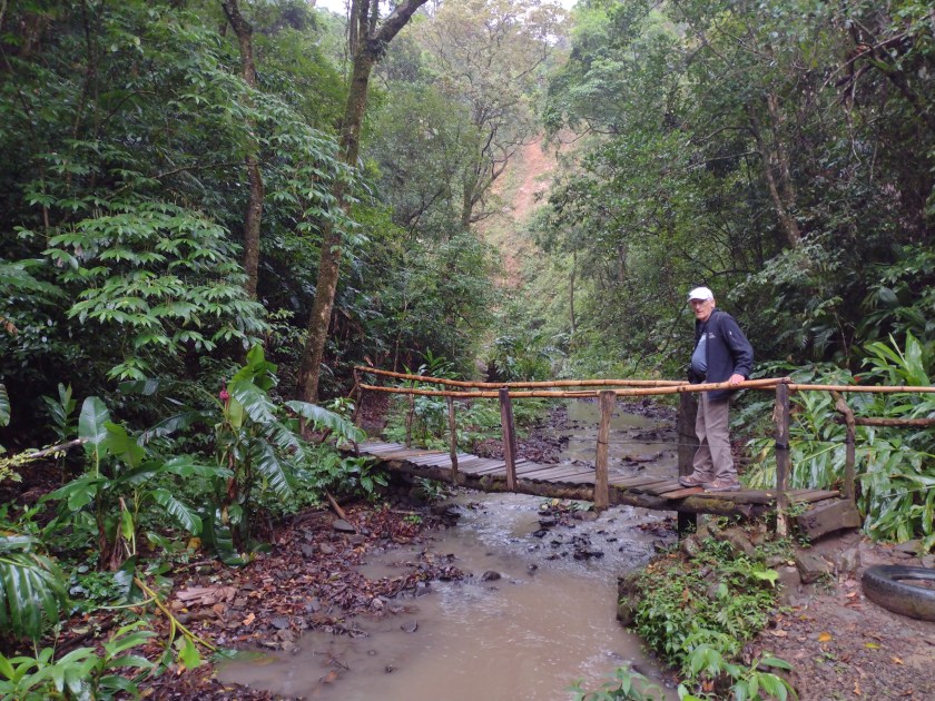 Our third day in Manuel Antonio was another jungle trek, but quite different than the others. A jolting 1-1/2 hour drive up into the mountains east of town brought us to Los Campesinos Ecolodge where our guide, Victor, was waiting to lead us on a hike. There didn’t appear to be any other guests at the lodge and it was only the three of us going on the hike. We were offered a snack of pancakes and juice before setting off on the hike.
