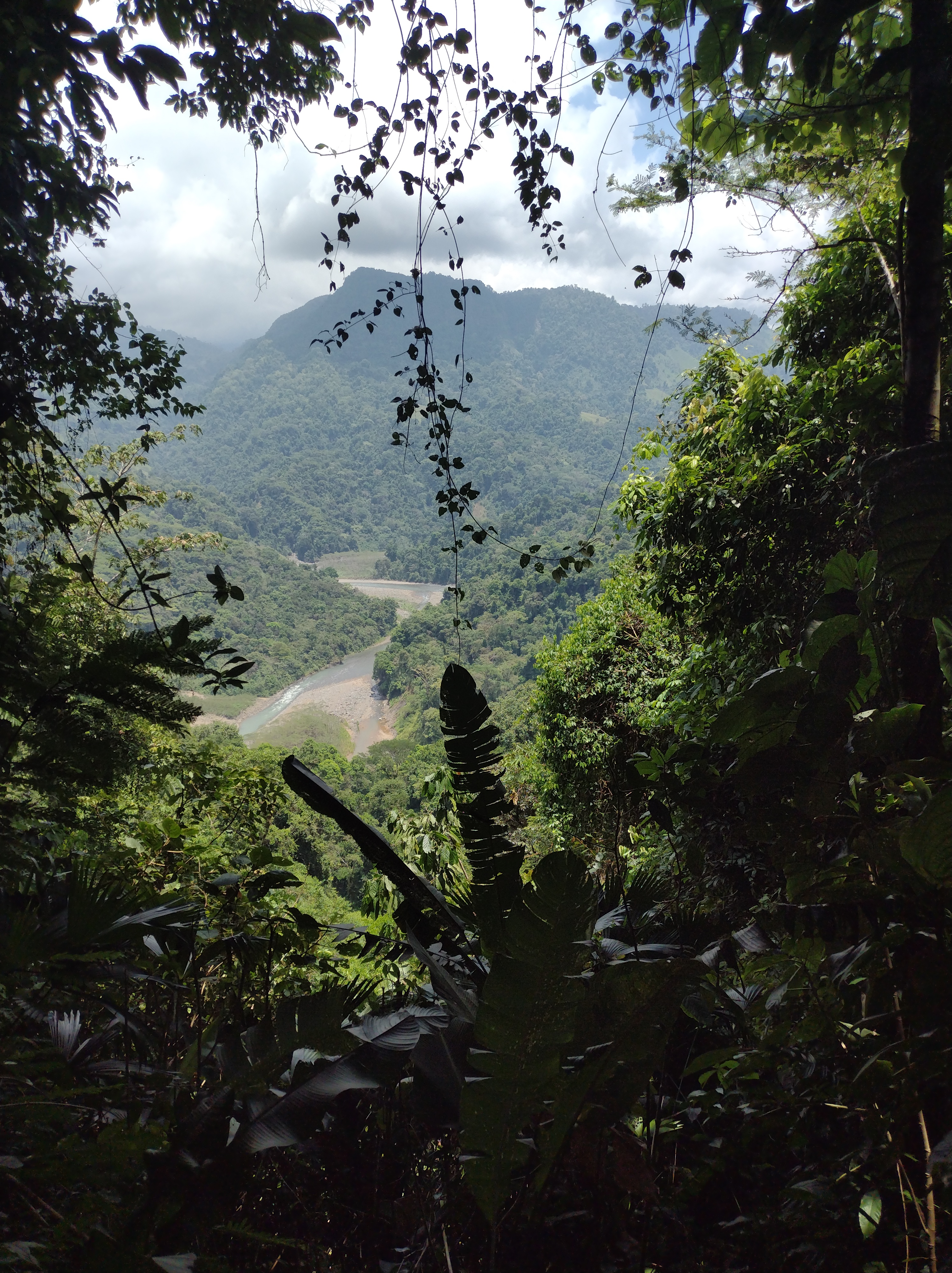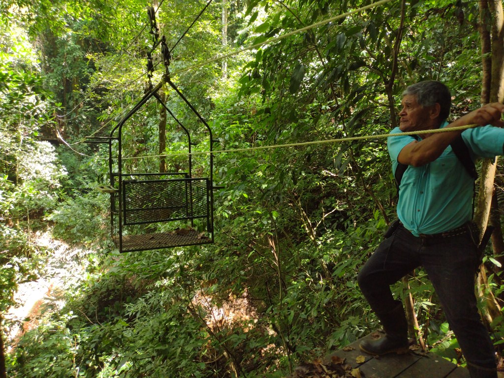 This was no casual nature stroll, but required 700 feet of elevation gain to get to the top of the mountain. At one point, we came to the edge of a deep ravine with a rope suspended over it. My first thought was that we were going to have to hang on to the rope to get across. As Victor started to reel in the rope I was relieved to see that there was a wire basket for us to stand in while he pulled us across.