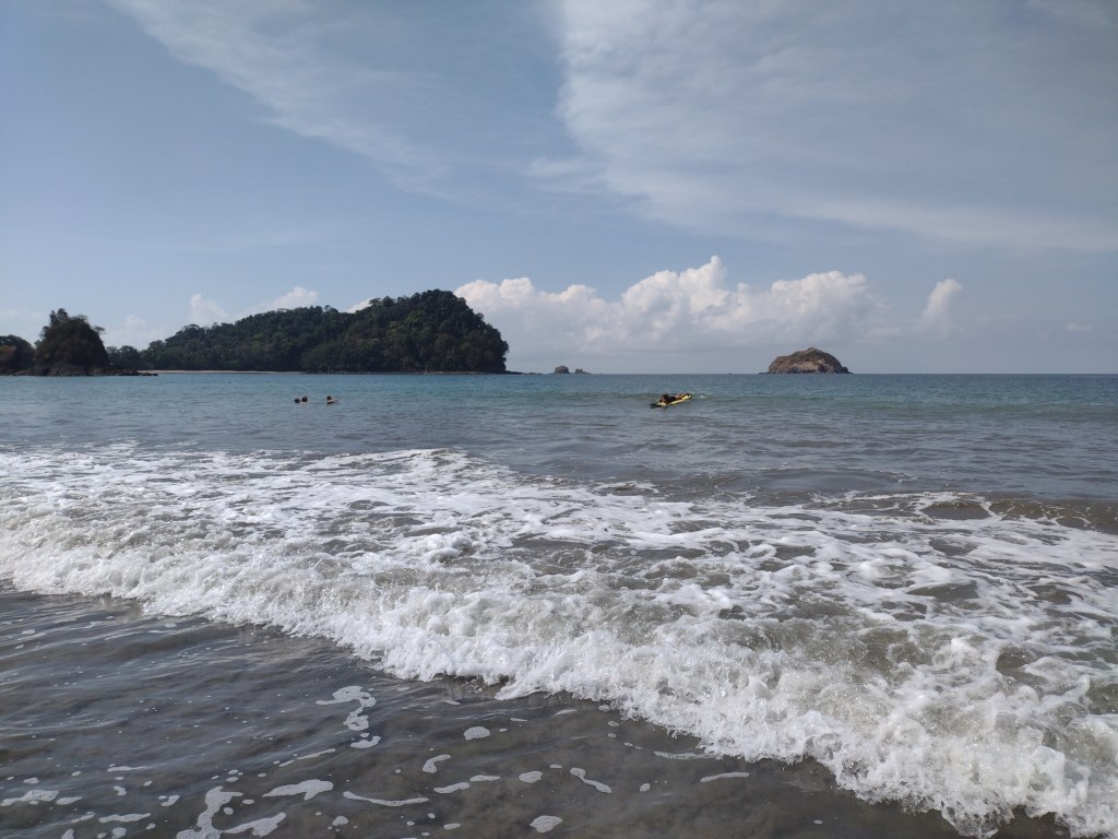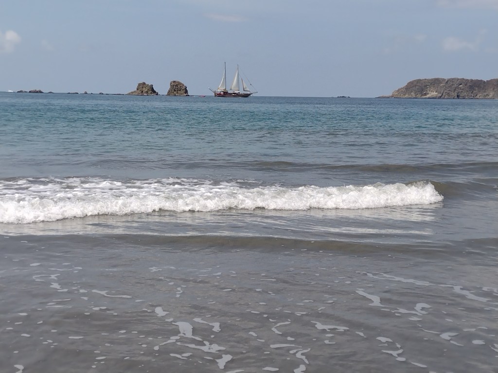 My experience of Pacific Ocean beaches is that it’s often windy or foggy with water that’s too cold for swimming. But the Pacific Ocean in the tropics is as warm as bath water. I hadn’t come prepared for swimming but as the morning heated up I enjoyed wading through the waves that were breaking on the shore.