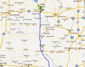 Well, I thought I knew the stretch of highway, but just when you think you know something, you find out you don’t know as much as you thought you did. We didn’t even make it out of Iowa City before we found ourselves going in circles downtown trying to figure out how to get back on the highway. Lee had wanted to go by the post office to mail a letter before we left town. All the time over the years that I have spent in Iowa City I guess I never had occasion to go by the post office. And after we mailed the letter and turned down a street I was suddenly in a part of town I didn’t recognize. I managed to get a map up on my smart phone but I wasn’t smart enough to realize that we were pointed south, not north. That meant that when I was looking at an upcoming intersection on the map and deciding that the street we wanted was to the right I should have been telling Lee to turn left because the map orientation was pointing north, not south. Oh well, we finally made it back to the highway.