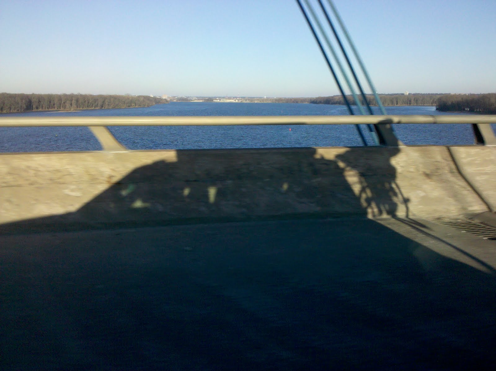 Look closely to see that this was my attempt to capture on film our Christmas Eve crossing of the Mississippi River from Illinois into Iowa. Weeks ago when I thought about all that needed to be done before we would be free to begin our adventure I had a hard time believing that we would be able to make it to Iowa for Christmas. To finally be getting there was a significant event. I also thought the picture had an interesting effect as it shows the shadow of our loaded car with bicycles on back reflected against the bridge’s guardrail.