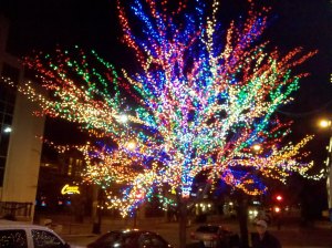 A nicely decorated tree on a Columbia, Missouri, street corner.