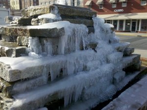 Whew, I’m sure glad the cold front that brought freezing temperatures as far south as Florida is on its way out of here. The above picture was taken this afternoon in front of a fountain in Rome, Georgia. I bet there aren’t too many times when that fountain has ice in it.