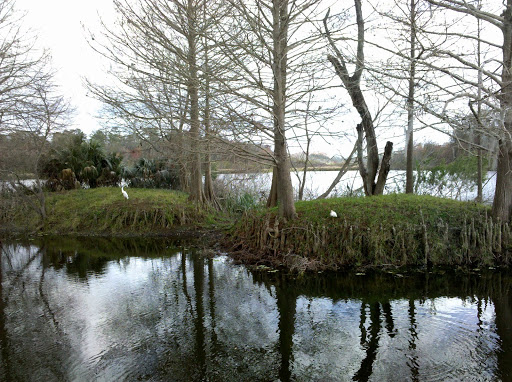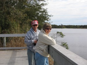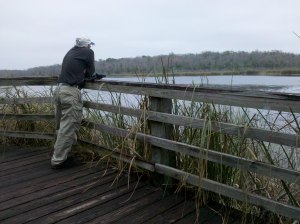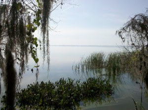 We returned to the state park in the afternoon and took advantage of the canoe rentals available in the park. For a minimal fee we were able to rent a canoe for a couple of hours. We paddled down the river to where it empties into the lake and then a bit further into the lake to get a good view. There were a number of alligators along the banks of the river and even one that actually slid into the water and started swimming mostly submerged but with his beady eyes peering up and seeming to look right at us. I told Lee I didn’t want to stick around to see if he was going to swim in our direction.