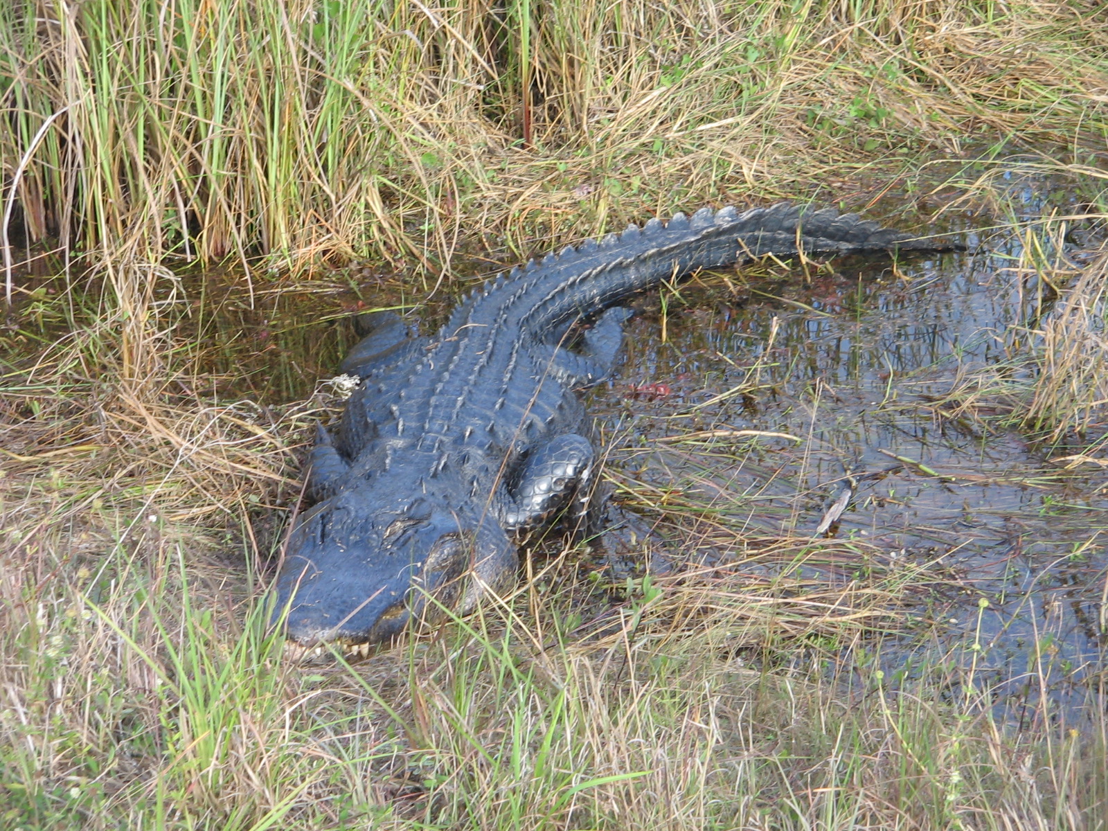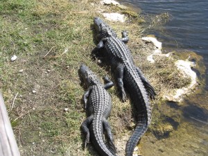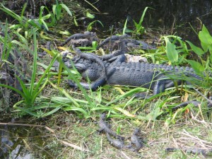 Alligators, alligators, alligators. I kept pleading with Lee that we just HAD to go through the Everglades because I really wanted to see alligators. And see alligators we did. During the 3 days there were many places we stopped to view them. They like to lay out in the sun next to ditches, as well as sometimes when we would see them floating in the canals like half-submerged logs. At no time did we ever see one that looked like it had enough energy to even care one bit that a bunch of tourists were there gawking and taking pictures. Notice in the third picture that this is a whole nest of alligators!