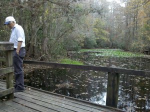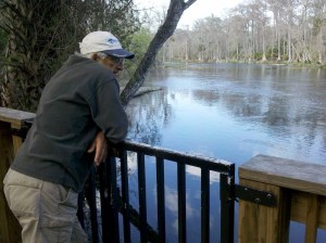 Silver Springs is the site of one of the largest artesian spring formations in the world, producing nearly 550 million gallons of crystal-clear water daily. In the mid-1800s tourists flocked by steamboat to see the crystal-clear waters of Silver Springs. In 1878 when Hullam Jones invented the glass bottom boat, its popularity soared, laying the groundwork for a flourishing tourist industry here. In the 1920s, Carl Ray and W.M. Davidson made the land around the headwaters of the Spring into something resembling the attraction that is there today, now known as the Silver Springs Nature Theme Park. The attraction features native animal exhibits and glass bottom boat tours of the springs. Since it is a separate, privately-owned concession, with a steep price tag we did not go to the theme park. Instead, we walked a couple of the trails that we hadn’t seen when we were first here. At the end of the Swamp Trail a viewing platform allowed us to peer over into Silver River, where we got a sense of the beauty of this clear water that allows you to see the sandy bottom, and many fish swimming through the grass and reeds.