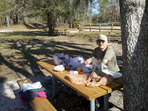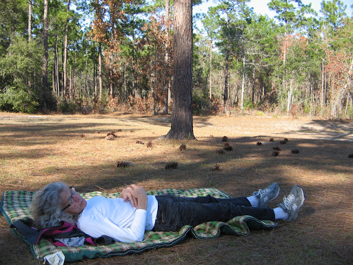 Yesterday’s bike ride and then the drive from Tallahassee to Ocala wore us both out. We decided that we would spend an extra day here in Ocala. After attending church at Ocala First Assembly we stocked up on lunch supplies and drove to a nearby county park. It was wonderfully peaceful there. After lunch we spread a blanket under a pine tree and rested there for most of the afternoon.