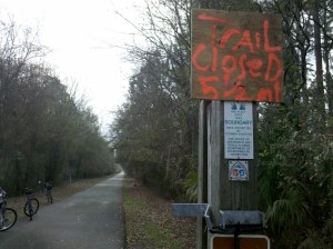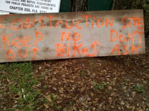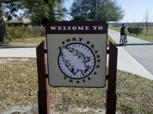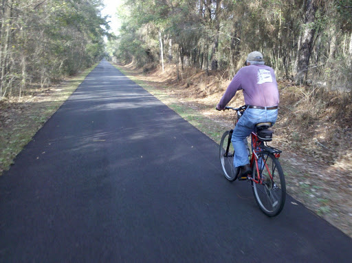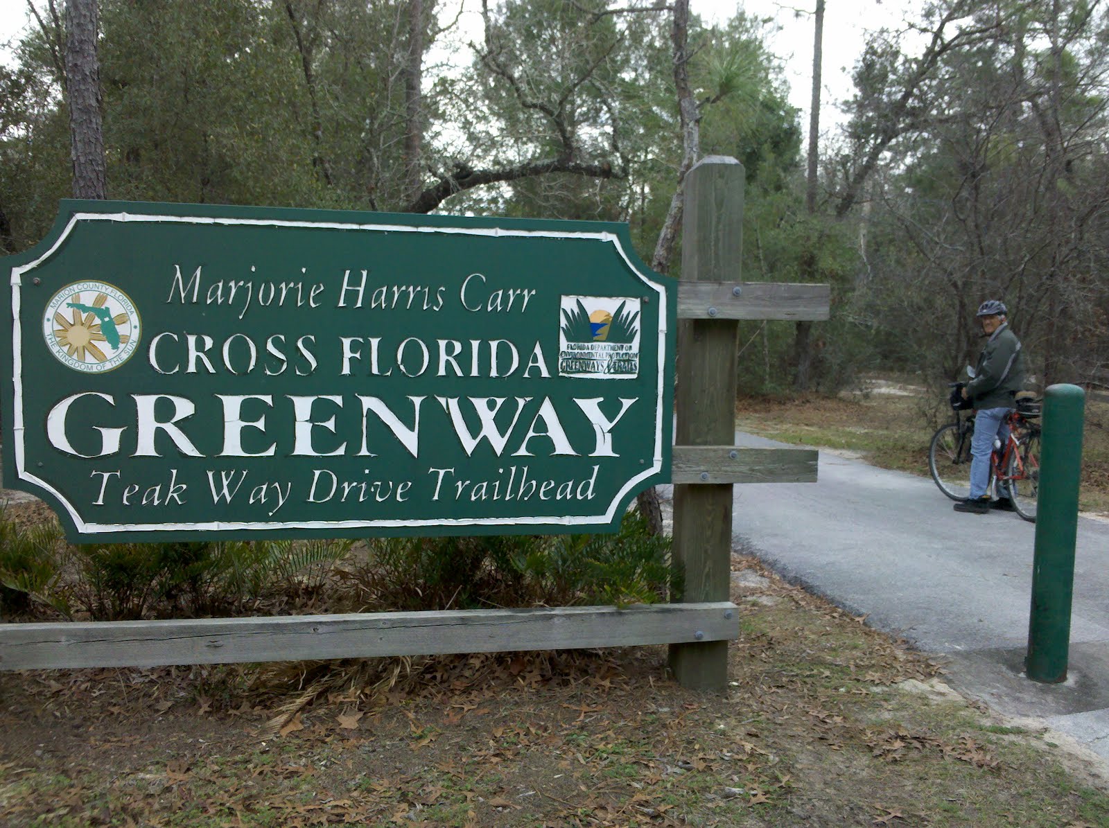 Given the weather conditions, we have temporarily delayed our plans to camp and have been spending more time investigating outdoor activities in the Ocala area. The Cross Florida Greenway trail has a section that passes through Ocala. One day last week, looking at a map, we were able to find a way to ride our bikes from the hotel room to the Teak Way Drive Trailhead.