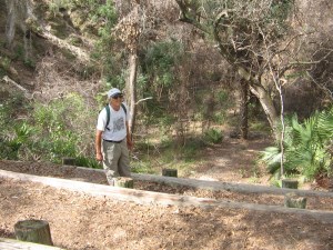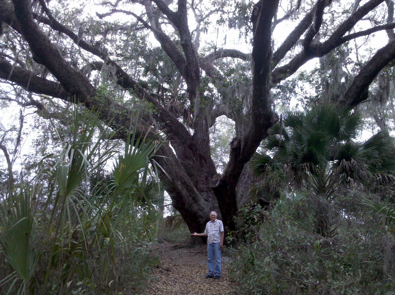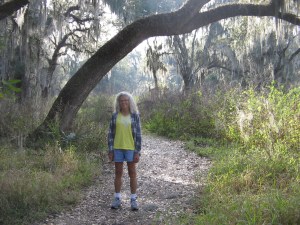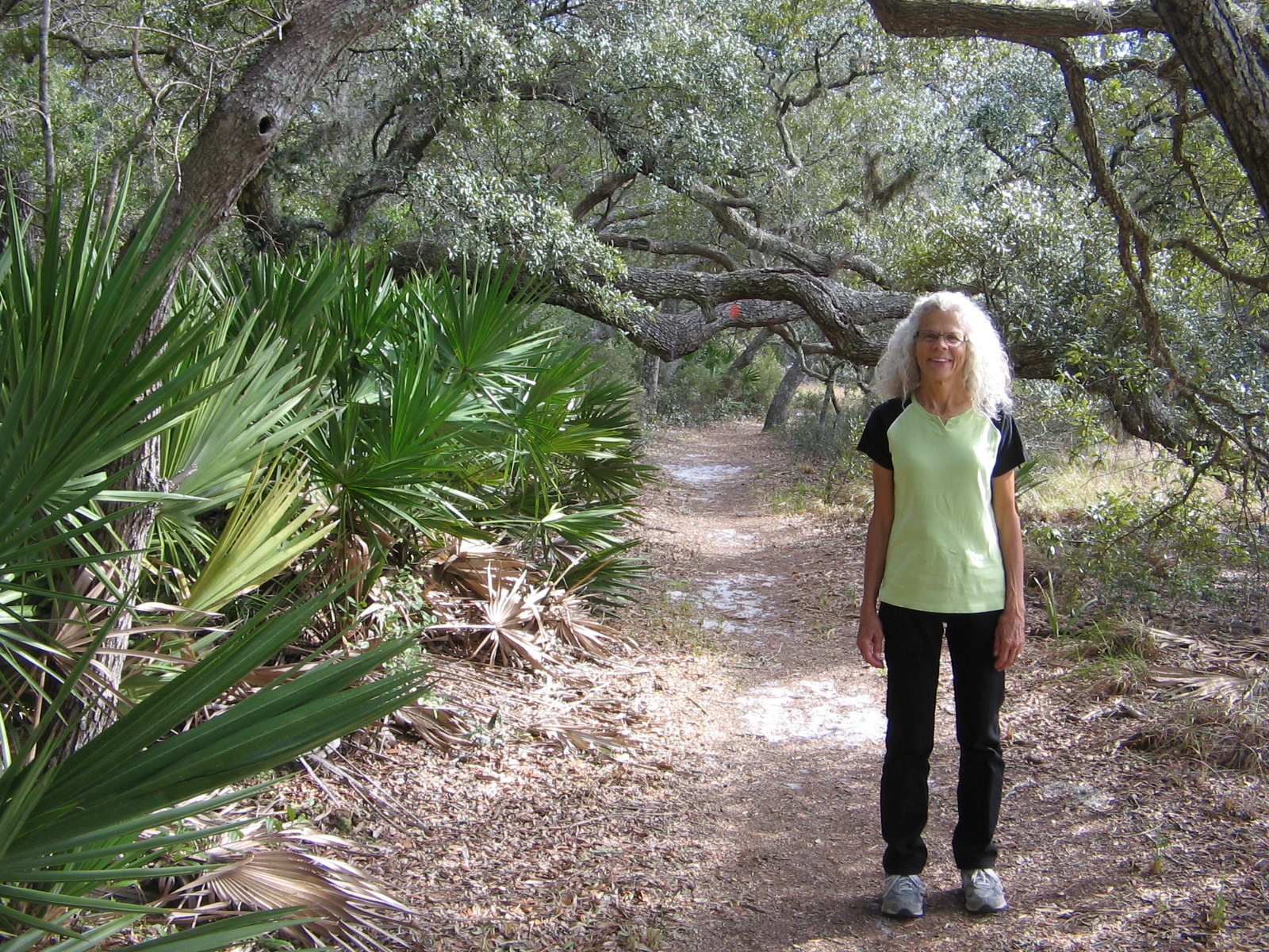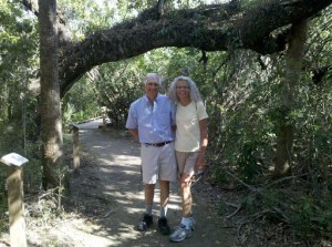This photo is not a close-up where you are able to see our tans. But we were pleased when a fellow walker on the trail offered to take a picture of both of us under a Live Oak that was branched across the trail.