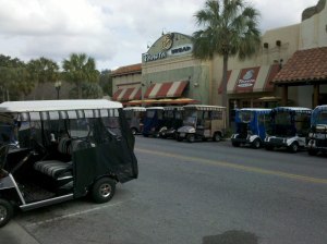 One of the things we had heard about The Villages was that everyone drives around in golf carts. As we walked the street towards the Information Center and glanced over at the parking in front of the Panera Bread, we saw evidence of the truth of that!