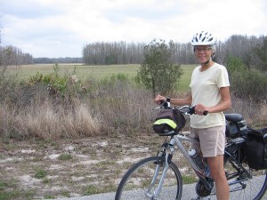 Speaking of predicaments, the first hour of this planned trip on the Van Fleet Trail found us in a predicament. The trail is 29 miles long, starting at the Mabel Trailhead near Claremont and ending at the Polk City Trailhead. Our friends, the Clendenin’s, who spend the winter in their RV at a park in Polk City, had kindly offered us overnight accommodations in an outside apartment on their lot. Our plan was to bike the 29 miles from the Mabel Trailhead to Polk City, spend the night, and then bike back the next day.