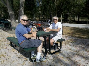 We had hoped to camp when we got here but the first night it looked like rain and we decided to get a motel instead. We stayed in Destin, Florida. Lee took a chance on finding the name of an old high school friend in the phone book for the nearby town of Niceville. They hadn’t been in contact for over 30 years, but Lee thought that Larry still lived in Niceville. Sure enough, his name was there, he answered the phone when Lee called, and he was delighted to hear we were in town. The next evening we enjoyed a delicious dinner with Larry and his wife while he and Lee hashed over old times.