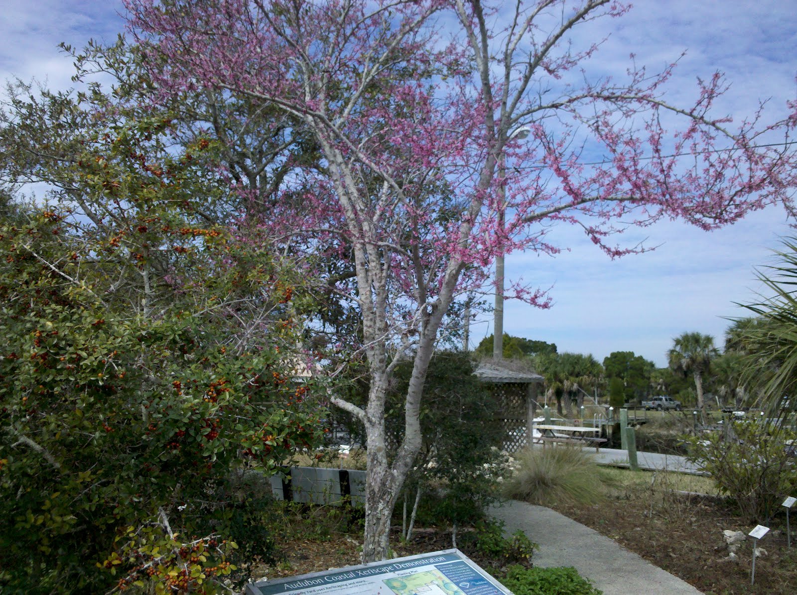 We were getting spoiled by this winter’s drought conditions in Florida, fooling ourselves into thinking that every day was going to be sunny and warm. On Monday evening this week we experienced the first rainfall of our time here. It didn’t rain on Tuesday, but that day was a first because it was a day when the sun remained behind clouds and never appeared the whole day. The weather front that brought the rain has been followed by some cooler temperatures. We are having to adjust our “sunny and warm” expectations a bit, but the weather is still plenty warm enough for our continued enjoyment of Florida outdoors. We have seen signs of spring, such as this redbud tree, which we would not expect to see in Virginia for at least another 6 weeks.