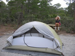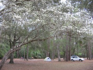 We’re back to civilization after a wonderful camping trip in the Ocala National Forest. The campground where we stayed at Salt Springs was an interesting combination of two very different types of camping experience. We were in the “primitive” area for tent campers, which was only primitive in the sense that it didn’t have electrical hookups. The restrooms and hot showers and tent sites were some of the best we’ve seen. It was quiet and practically deserted.
