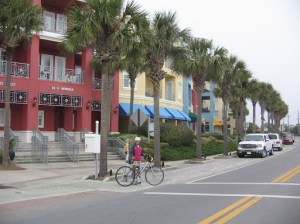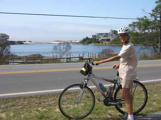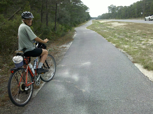 Topsail Hill Preserve State Park is part of a 26-mile stretch of the Florida Gulf Coast called the Beaches of South Walton. Half of the land is set aside for state parks and forests, but the other half is a popular resort area with the type of development associated with beach towns. We got an opportunity to view the contrast of nature and commercial development on the day that we rode our bikes on a portion of the Timpoochee Trail. Street scenes on Timpoochee Trail through Beaches of South Walton.